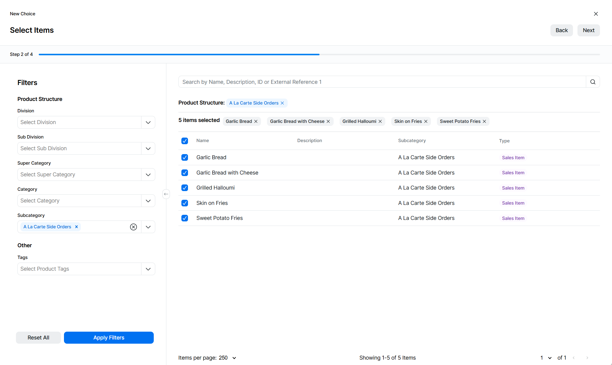 The following types can be added to a choice: Sales Item | Choice | InstructionClick here for more information on filtering and searchingProduct Structure Filter & Search Tips