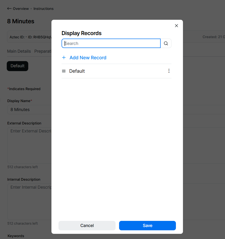 Each new instruction created will automatically be added with a default record, which is shown in the display details tab.
