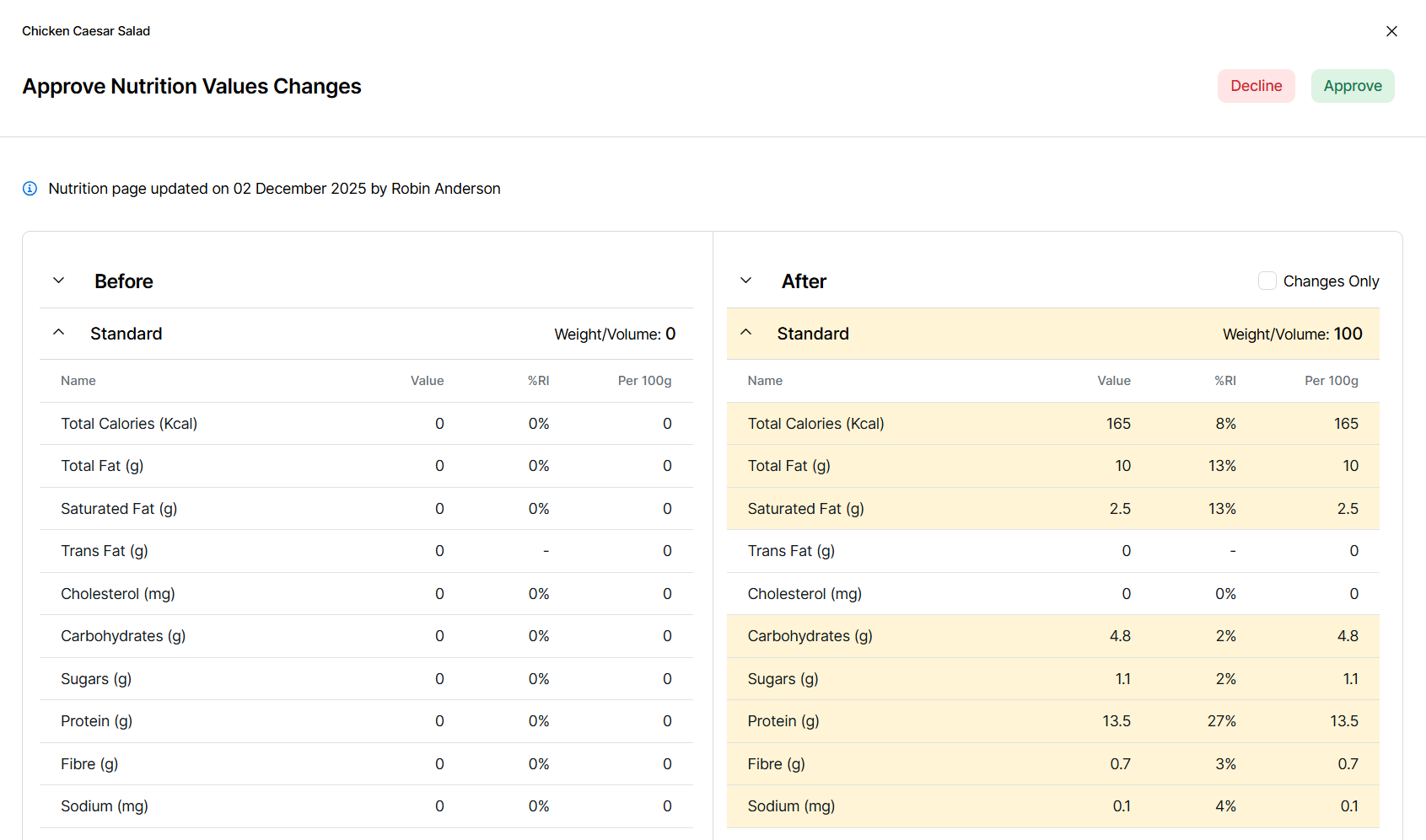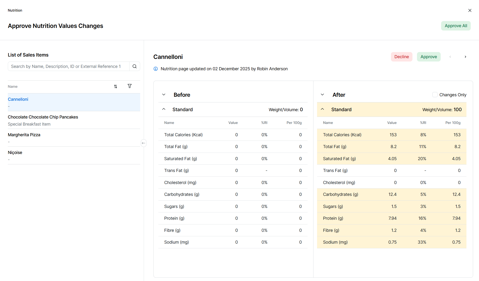 All new nutritional information additions or changes must be approved before it becomes available