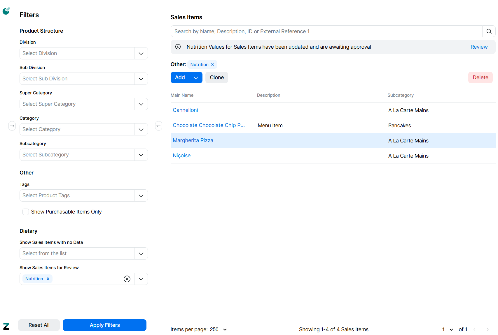Select the Nutrition filter for "Show Sales Items for Review"