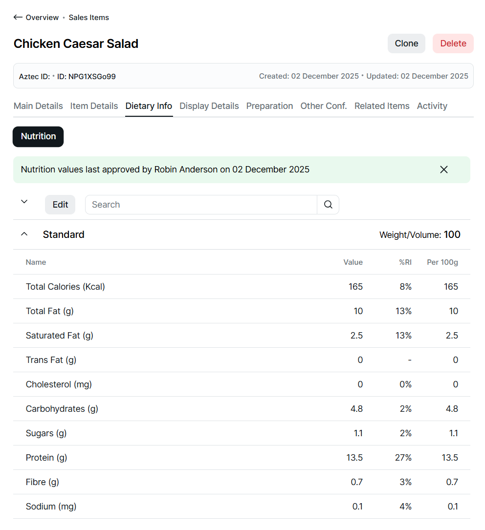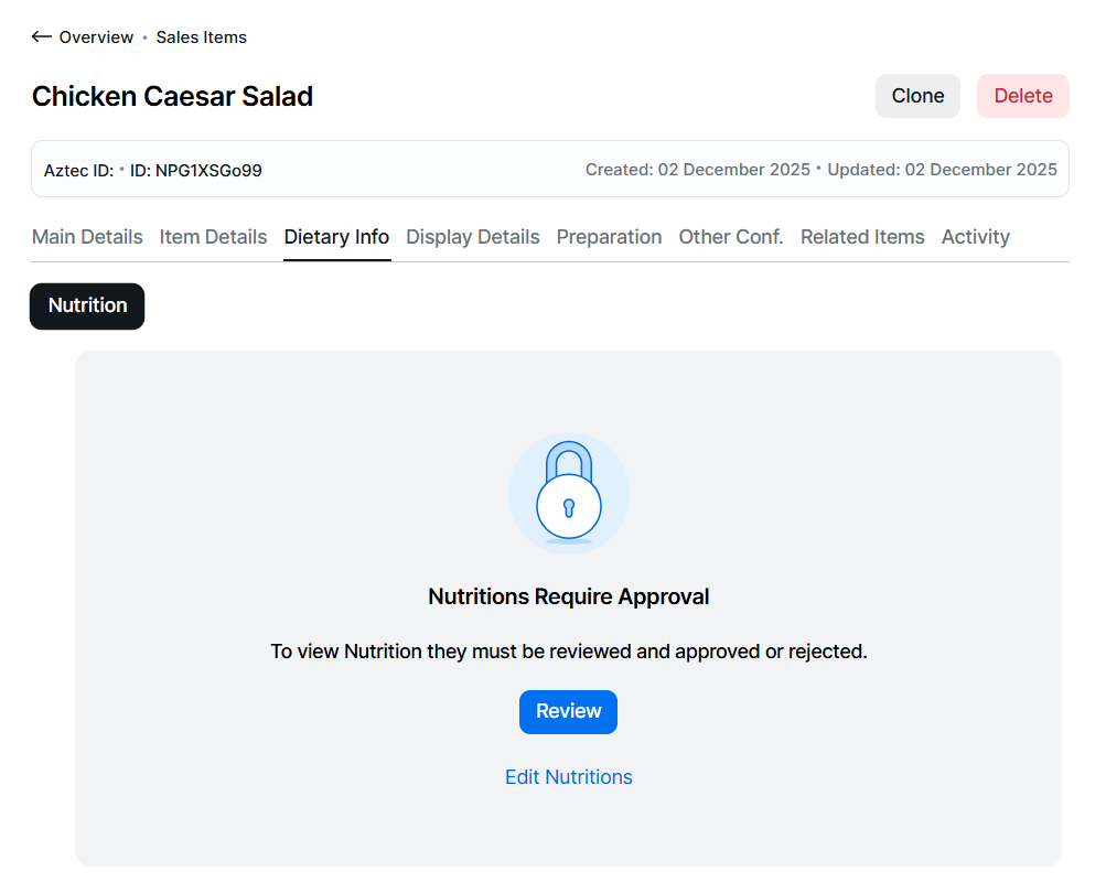 The nutritional information will be displayed in a waiting for review state and should be completed as per the review process above