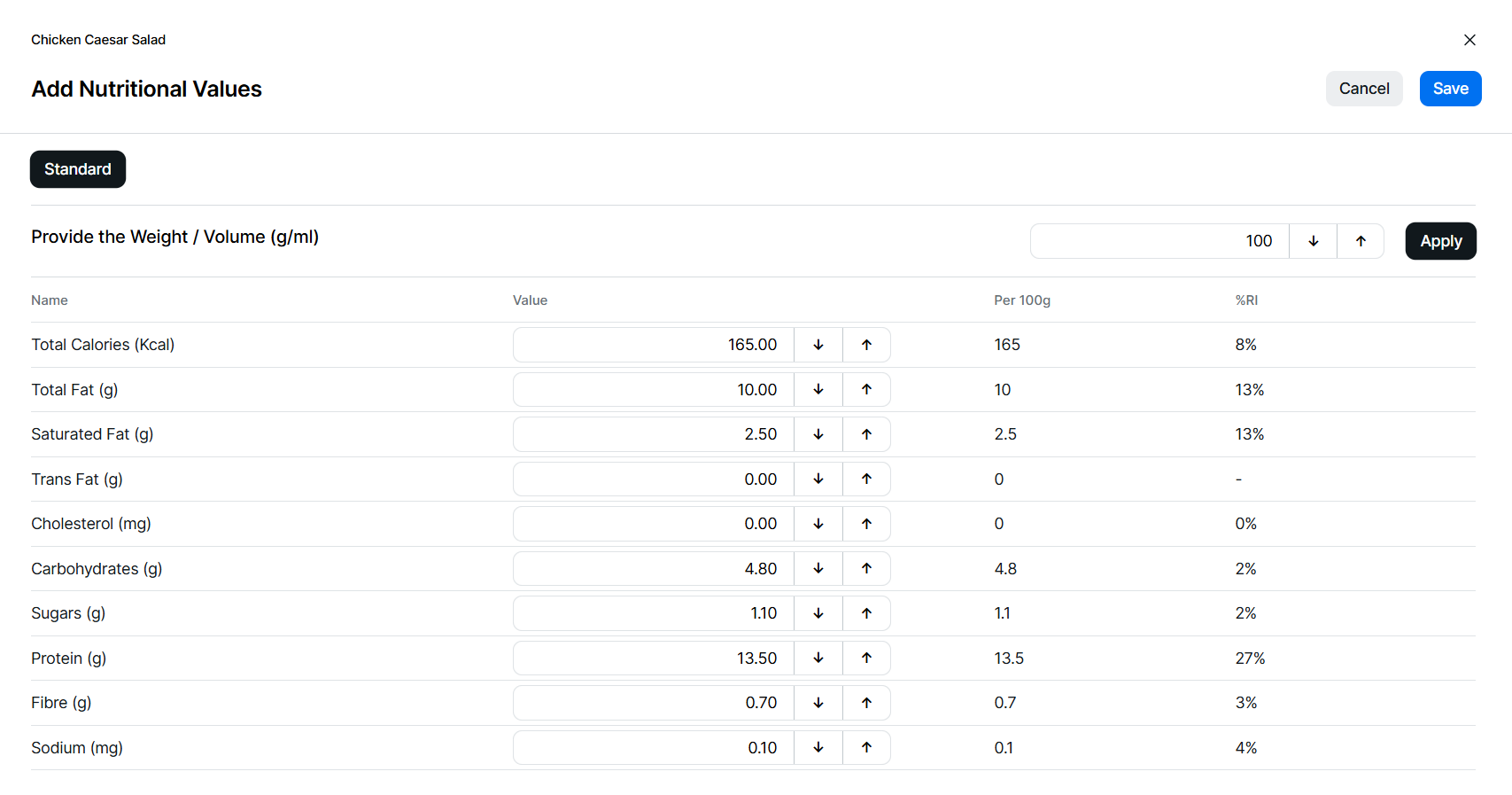Enter the value per weight or volume in grams or millilitres | click Apply
