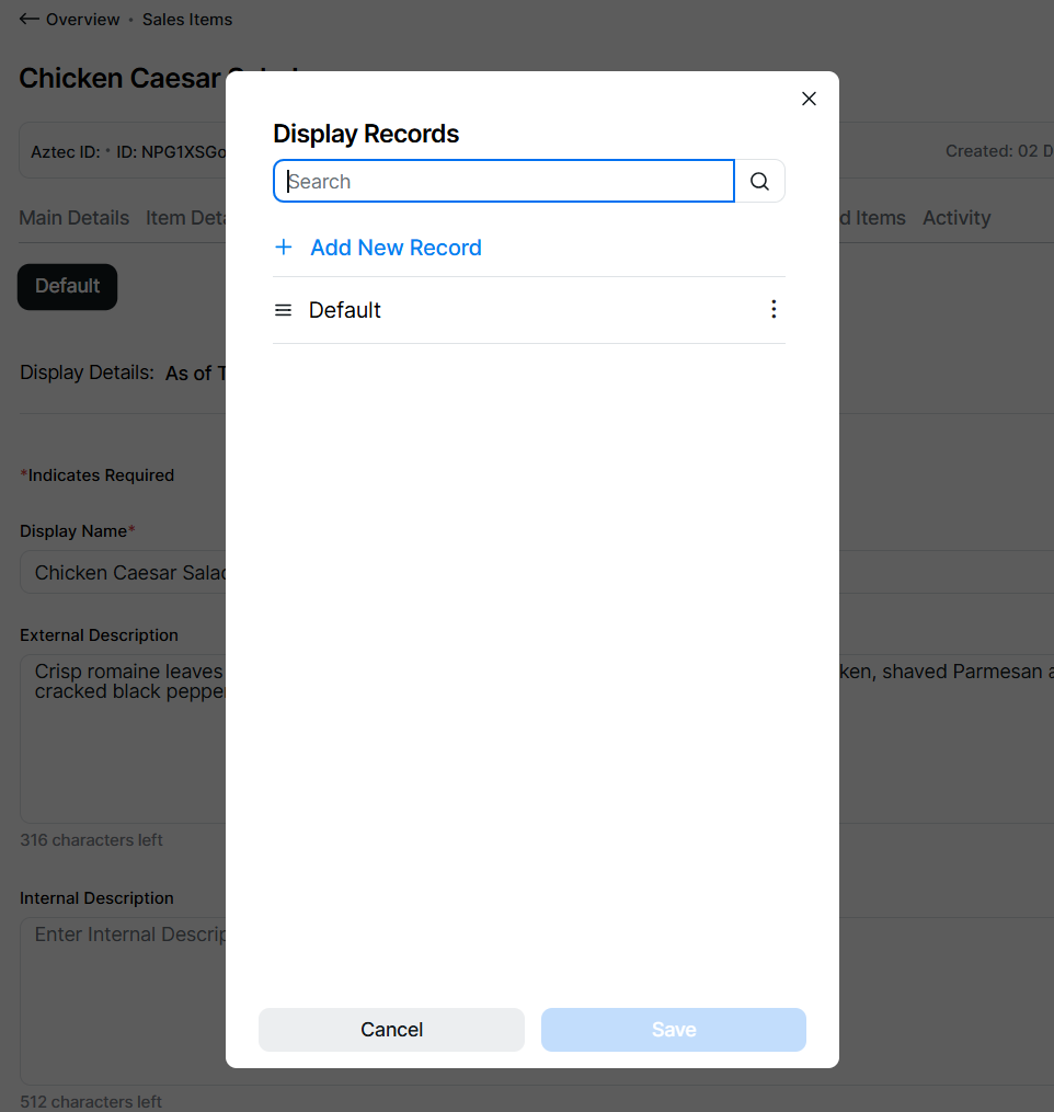 Any items hydrated from iOrder Platform that do not contain a display record will be shown in an empty state and require a record to be added, for new sales items there will be a default record automatically be added, which is shown in the display details tab.