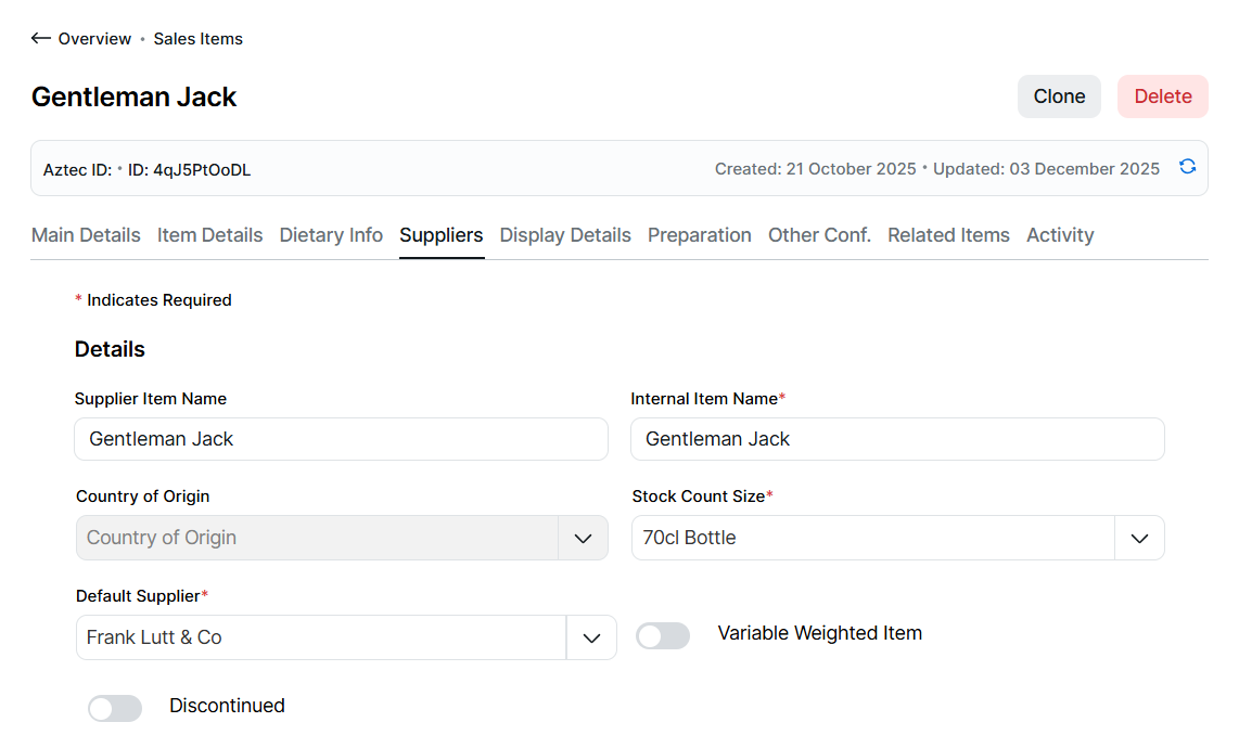 | Variable Weighted Item | The variable weighed item toggle is used to define items purchased from suppliers that have a weight between x and y, it is used between Acquire and Aztec+ Stocks to help identify the correct weight when items are delivered and updating stocks |