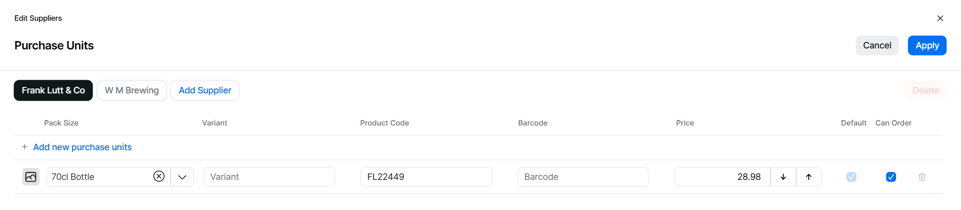 Upon selection of the new supplier it will automatically navigate to this supplier to add new purchase unitsIf more than one purchase unit has been entered for the same supplier the default purchase unit check-box will become available, the first entered unit will be set the default but can be changed as required to any other entries within the list -